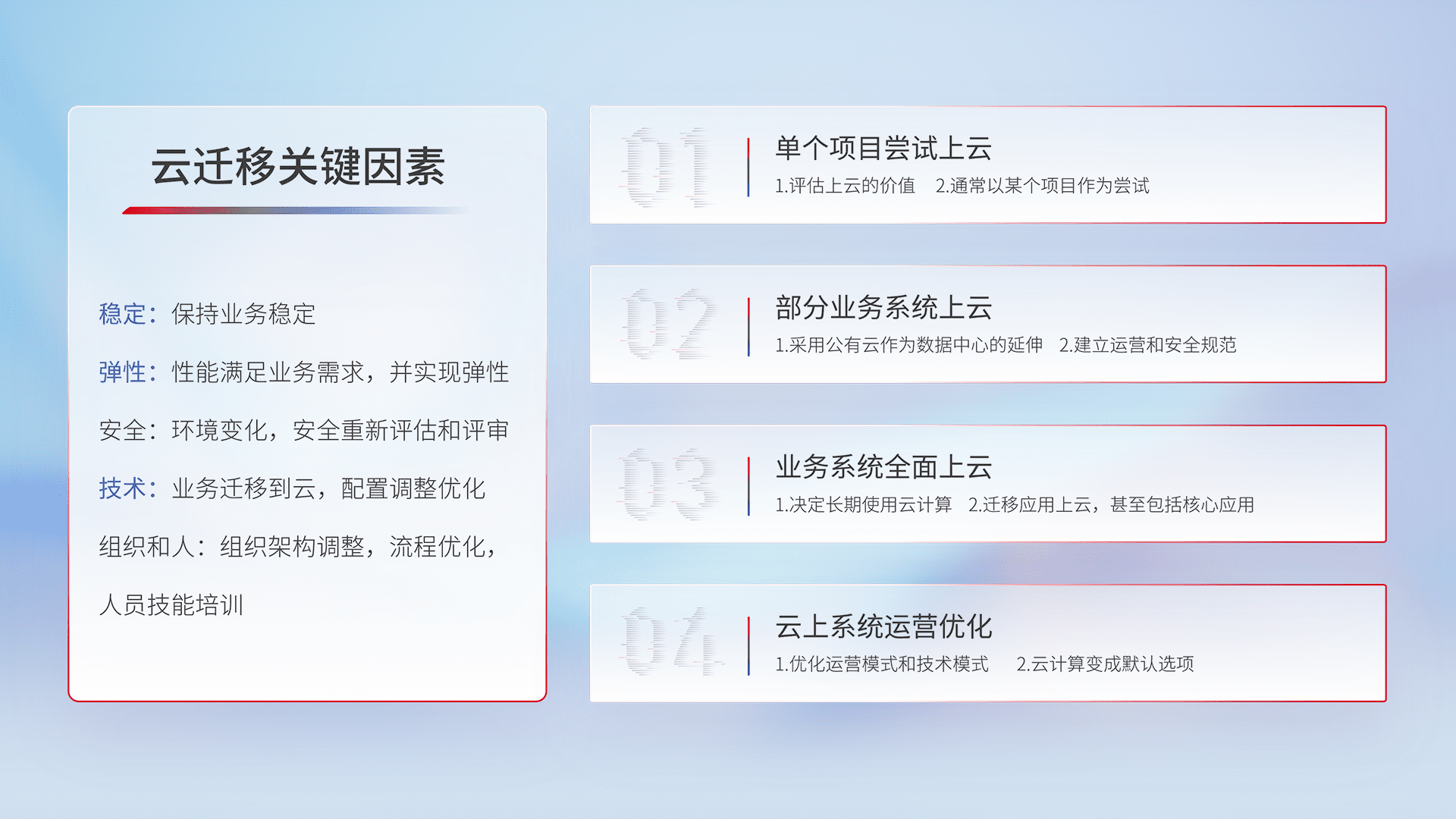 结合实际业务,,,,从规划设计、、云平台选型、、、云原生改造、、数据迁移、、、集成交付,,,迁移全过程为客户识别最佳上云路径,,,,做好风险识别管理,,设计网络架构、、身份权限、、、安全审计合规、、、操作审计、、、、日志审计、、、、监控告警策略、、、、多站点容灾设计等,,对云上基础设施进行整体规划,,提升IT治理水平,,,,以满足弹性、、高可用、、、高性能的需求。。。。
